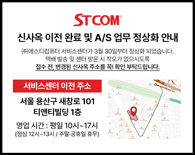 MAINstcom2026-03-30T13:49:52+09:00 사옥이전안내서비스센터 이전 완료 및 정상 영업 안내㈜에스티컴퓨터 서비스센터가 3월 30일부터 정상화 되었습니다. 택배 발송 및 센터 방문 시 착오가 없으시도록 접수 전, 변경된 신사옥 주소를 꼭! 확인 부탁드립니다. 신규 주소 서울 용산구 새창로 101 티앤티빌딩 1층 (용문동 32-147) 영업 시간 : 평일 10시~17시 (점심 12시~13시 / 주말·공휴일 휴무) 라데온 번들이벤트운명을 쟁취하세요진짜 게임을 시작해보세요일부 AMD 제품 구매시 Crimson Desert™ 제공행사 기간|2026년 2월 10일 ~ 4월 25일*번들 코드 리딩 종료일 : ~ 2026년 5월 23일까지(리딩 종료일 7일 이전 리딩 권장)행사 제품|XFX 라데온 RX 9070 / RX 9070 XT 그래픽카드 단품 혹은 탑재된 조립PC18+. 이용 약관 전문: www.amdrewards.com/terms.이벤트 자세히보기NVIDIA 번들이벤트다시 시작된악몽행사 대상 GeForce RTX 50시리즈를 구매하고 BIOHAZARD Requiem을 받아가세요*행사 기간 2026년 2월 10일 ~ 3월 30일*번들 코드 리딩 기간 : 2026년 4월 30일까지행사 제품 PNY GeForce RTX 5090, RTX 5080, RTX 5070 Ti, RTX 5070 그래픽카드 단품 혹은 탑재된 조립PC*약관 및 조건 적용이벤트 자세히보기STCOM PC실속 있는 조립PCSTAI & STCP 시리즈강력한 성능과 합리적인 가격의 PC와 STCOM만의 서비스를 동시에! 제품 보러가기넥스원 워크스테이션비즈니스 최적화 워크스테이션NEX-ONE 시리즈기업의 비즈니스 역량을 극대화하는 최고 효율의 워크스테이션 솔루션 제품 보러가기ASUS X870시리즈ROG Crosshair X870EGLACIAL & DARK HERO강력한 전원부와 흔들림없는 안정성 고성능 설계로 최상의 시스템 빌드 제품 보러가기ASUS B850M-PLUS WIFI7TUF GAMINGB850M-PLUS WIFI714+2+1(80A) 페이즈의 강력한 파워 스테이지 더 넓은 대역폭의 차세대 WiFi7 적용 제품 보러가기XFX RX9070XT SWIFTXFX RADEONRX 9070 XT SWIFT차세대 인터페이스 PCIe 5.0 지원 RDNA™ 4 아키텍처로 더 강력한 퍼포먼스 제품 보러가기PNY RTX50seriesPNY GeForceRTX™ 50 Series5세대 Tensor 코어와 4세대 레이 트레이싱 코어 적용 강력한 Ai 연산 능력으로 빠른 작업 속도 제품 보러가기 STCOM 유통 제품군 메인보드 제품 보러가기 > 그래픽카드 제품 보러가기 > 서버/워크스테이션 제품 보러가기 > STCOM PC 제품 보러가기 > STCOM 공식 사이트 서버/워크스테이션견적문의 일반 제품군네이버스토어 서버/워크스테이션네이버스토어 STCOM네이버카페 STCOM네이버 블로그 STCOM TV유튜브 STCOM 공식인스타그램 PARTNER BRAND BEST | NEW ASUS, GPU 서버/워크스테이션, 기업용 제품, 전체 제품보기 ASUS ESC8000A-E13 (RTX PRO 6000 Blackwell MWE x2) ASUS 메인보드, 메인보드 제품군, 전체 제품보기 ASUS TUF Gaming B850M-PLUS WIFI7 PNY 그래픽카드, 전체 제품보기 PNY 지포스 RTX 5060 OC D7 8GB Dual Fan XFX (라데온 그래픽카드), 그래픽카드 제품, 전체 제품보기 XFX 라데온 RX 9060 XT SWIFT DUAL OC D6 16GB Intel CPU, STCOM PC, STCOM STCP, 전체 제품보기 STCP-i2 Intel CPU, STCOM PC, STCOM STCP, 전체 제품보기 STCP-i1 AMD CPU, STCOM PC, STCOM STCP, 전체 제품보기 STCP-6200 AMD CPU, STCOM PC, STCOM STCP, 전체 제품보기 STCP-6100 EVENT