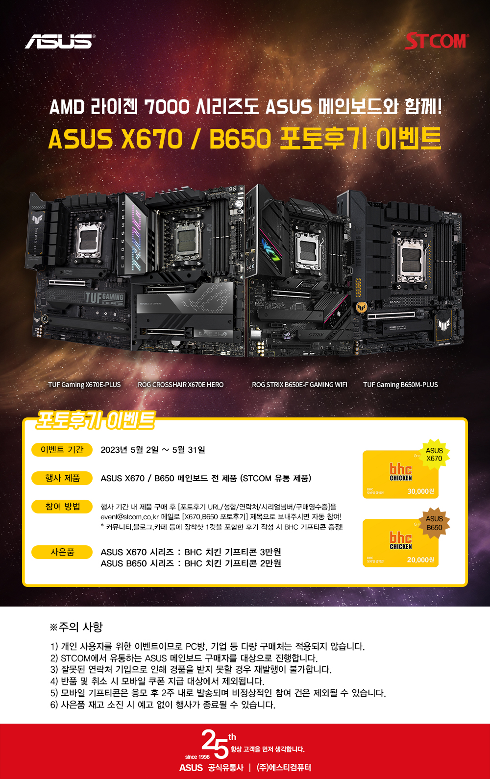 2023년 5월 2일부터 5월 31일 까지 진행하는 이 이벤트는 행사 기간 내에 STCOM에서 유통하는 ASUS X670E, X670, B650E, B650 메인보드를 구매 후 커뮤니티, 네이버 블로그, 카페 등에 장착샷 1컷을 포함한 사용 후기를 작성한 후 event@stcom.co.kr로 성함과 연락처, 시리얼 넘버와 구매영수증, 사용기 URL을 첨부하여 신청 시 모바일 BHC 치킨 기프티콘을 받을 수 있다.