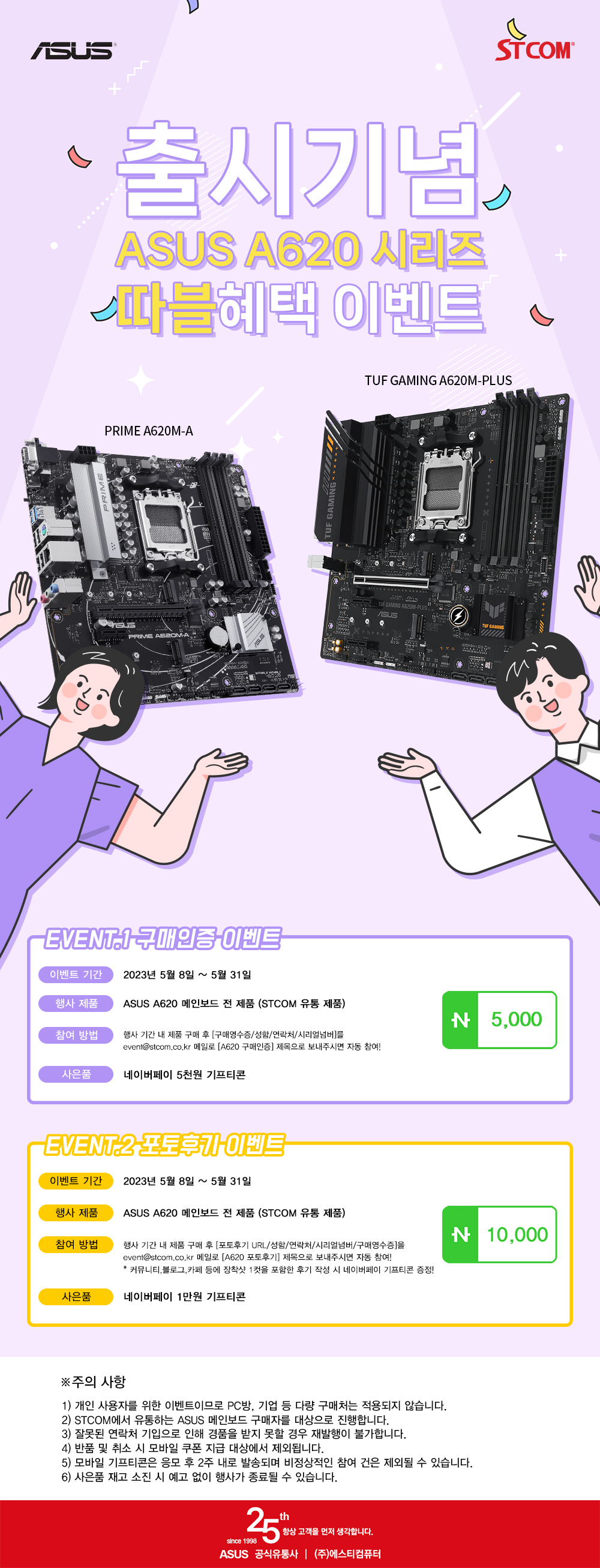 ASUS 메인보드를 국내에 공급하고 있는 (주)에스티컴퓨터 (대표: 서희문, 이하 STCOM)는 신규로 출시한 ASUS A620 시리즈 메인보드 구매자를 대상으로 특별한 구매 행사 2종을 진행한다.