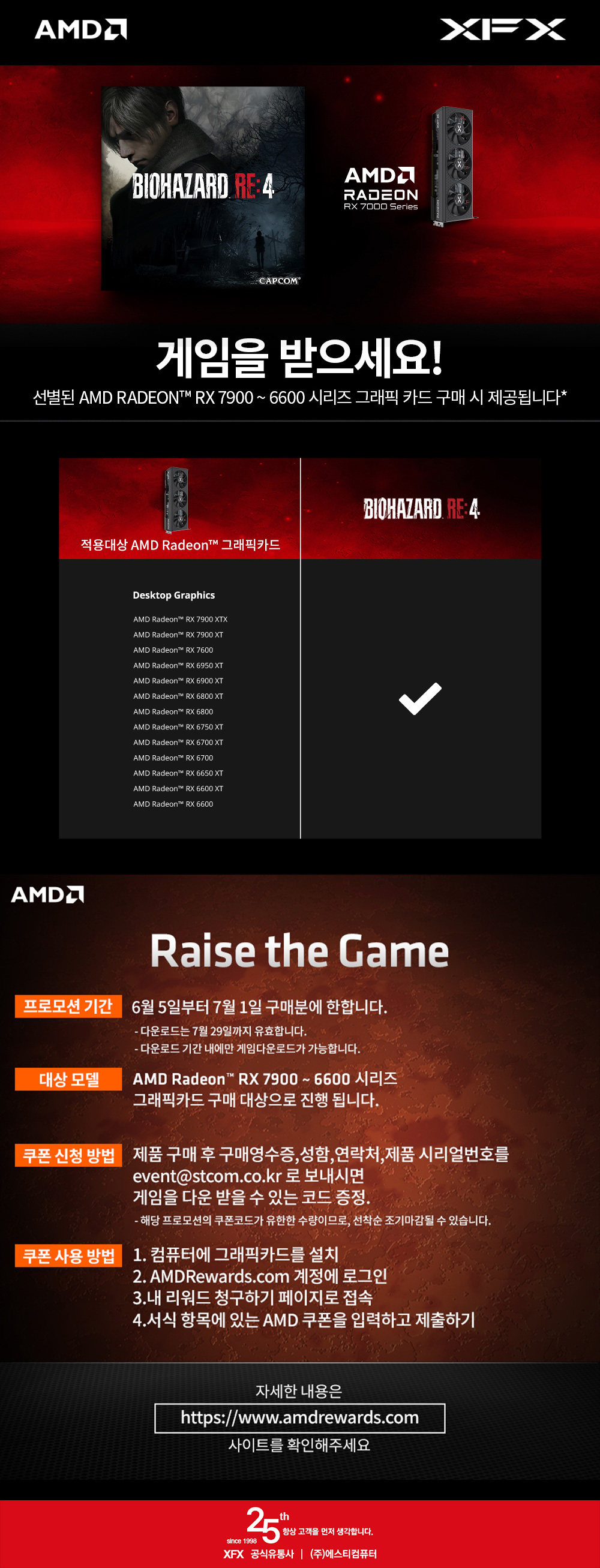 1998년 설립되어 25년간 컴퓨팅 관련 솔루션을 유통해온 전문 유통사인 (주)에스티컴퓨터 (대표: 서희문, 이하 STCOM)에서 XFX 라데온 RX 6000 & 7000 시리즈 그래픽카드 구매 시 바이오하자드 4 리마스터 번들 증정 이벤트를 진행한다고 밝혔다.