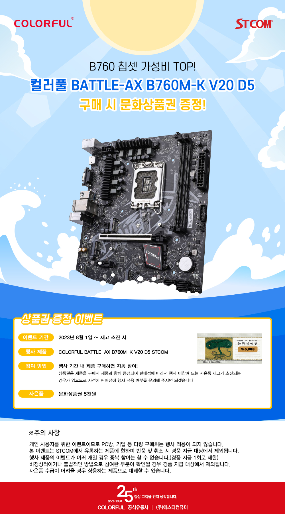 해당 구매 사은품 증정 행사는 2023년 8월 1일 구매자부터 진행되며, 기간 내에 STCOM에서 유통하는 컬러풀 BATTLE-AX B760M-K V20 D5 메인보드를 구매 시 문화상품권 5,000원 권을 추가로 증정 받을 수 있다.