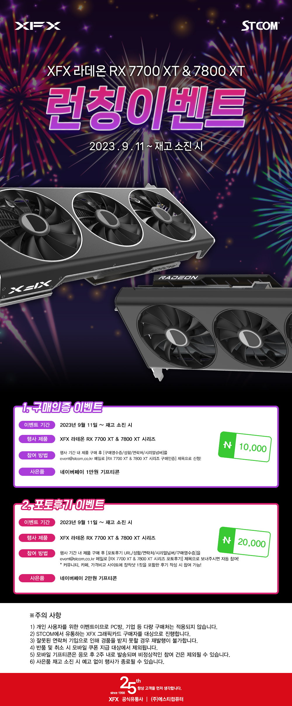 1998년 설립되어 25년간 컴퓨팅 관련 솔루션을 유통해온 전문 유통사인 (주)에스티컴퓨터 (대표: 서희문, 이하 STCOM)에서 XFX 라데온 RX 7800 XT & RX 7700 XT 그래픽카드 출시 기념 더블 혜택 이벤트를 진행한다고 밝혔다.