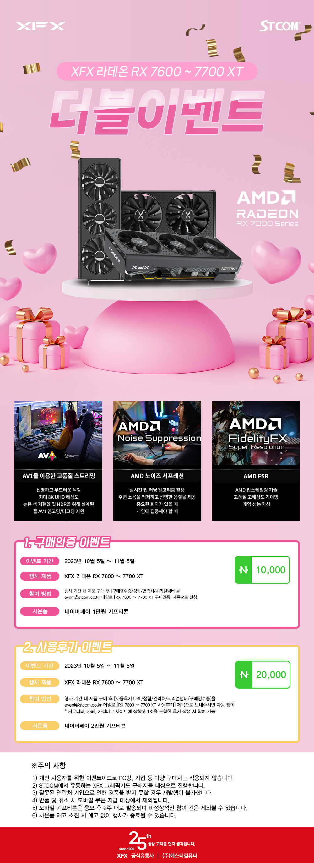 1998년 설립되어 25년간 컴퓨팅 관련 솔루션을 유통해온 전문 유통사인 (주)에스티컴퓨터 (대표: 서희문, 이하 STCOM)에서 XFX 라데온 RX 7600 ~ RX 7700 XT 시리즈 구매자를 대상으로 더블 이벤트를 진행한다고 밝혔다.