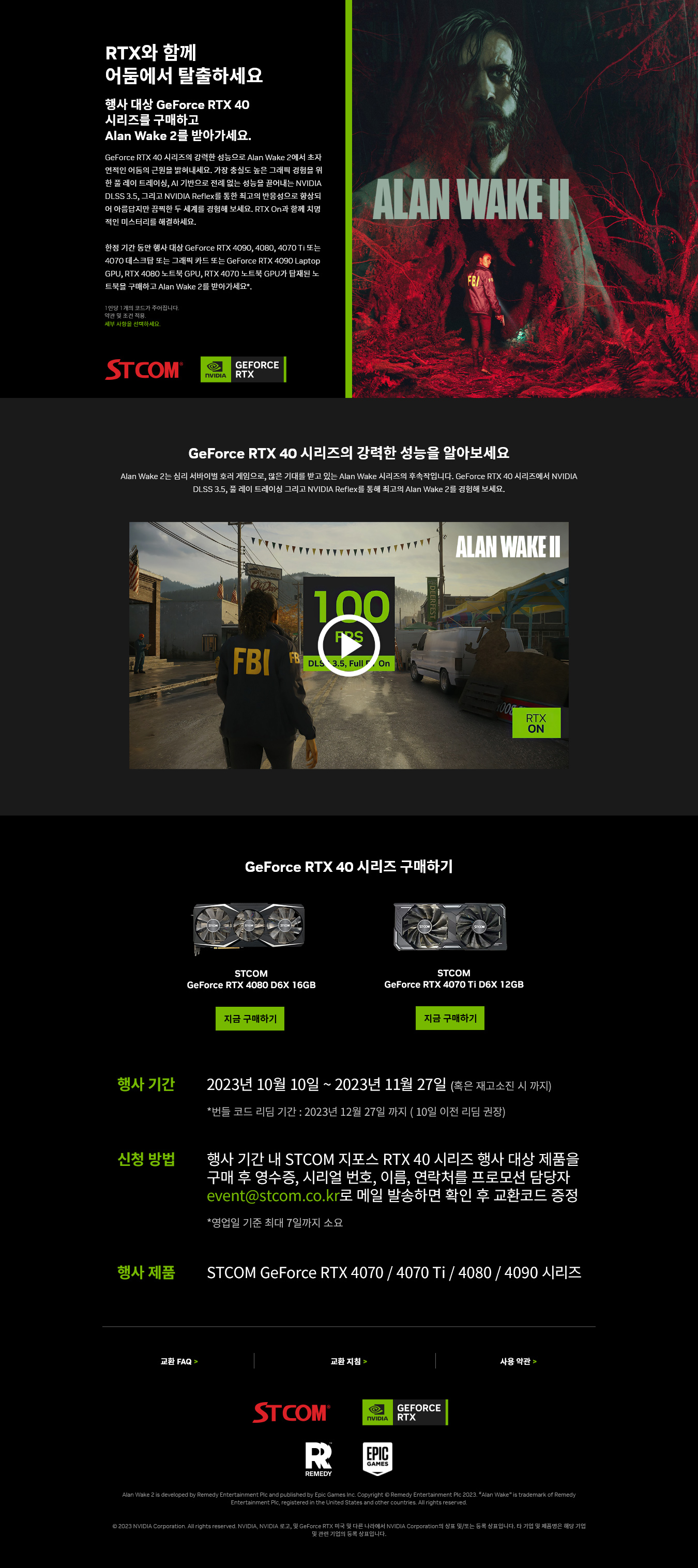 앨런 웨이크 II 게임 쿠폰 증정 이벤트는 2023년 10월 10일 부터 11월 27일 내에 STCOM 지포스 RTX 40 시리즈 그래픽카드를 구매할 경우 참여가 가능하며 증정 받은 게임코드는 2023년 12월 27일까지 등록할 수 있다. 정확한 행사 대상 제품은 하기와 같다.