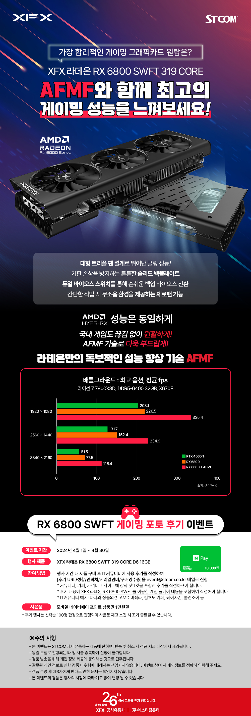 포토 후기 행사는 2024년 4월 1일부터 4월 30일까지 XFX RX6800 SWFT 319 CORE D6 16GB 구매자를 대상으로 진행되며 커뮤니티, 가격비교사이트 등에 장착 사진 1컷을 포함하여 게임 플레이 내용을 포함한 사용기를 작성 시 참여할 수 있다. event@stcom.co.kr 로 후기 URL, 구매 영수증, 시리얼 번호, 성함 및 연락처를 접수하여 신청이 가능하며 한정된 수량의 사은품으로 진행되므로 소진 시 조기에 종료될 수 있다.