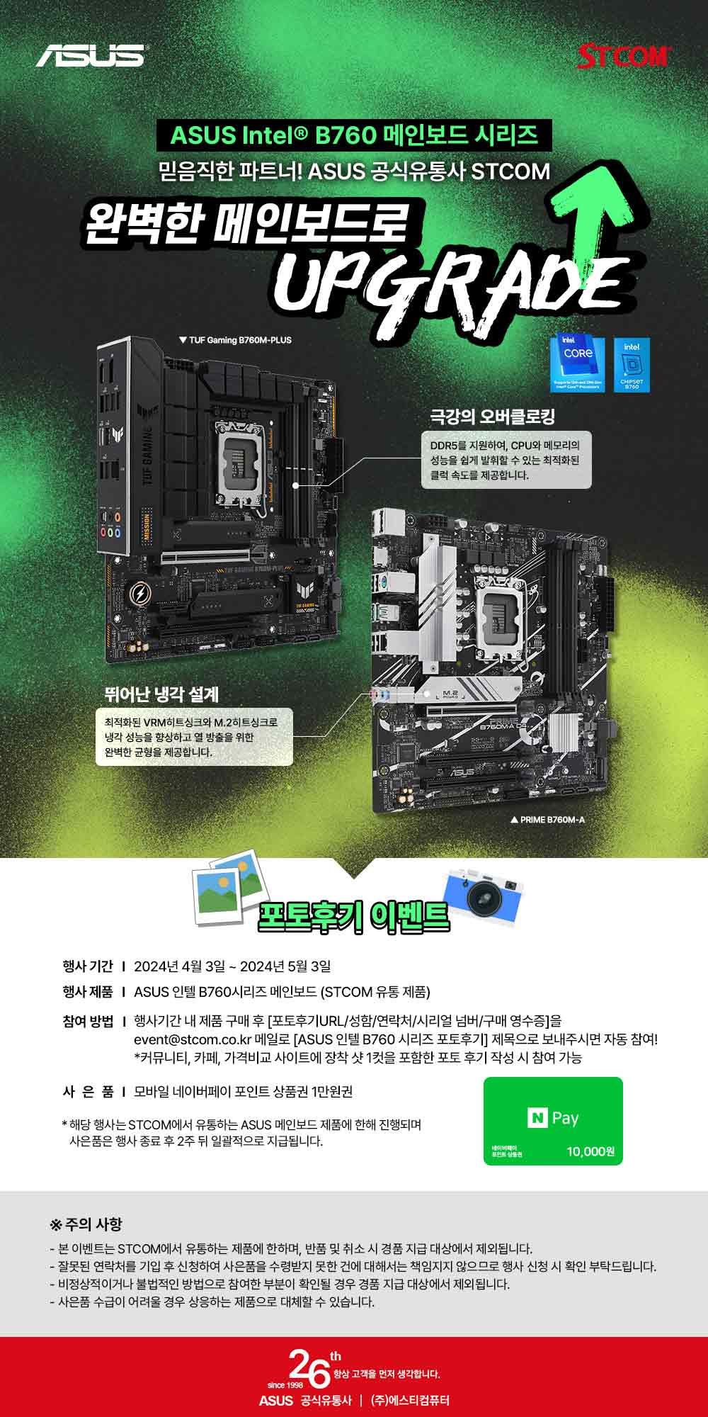 포토 후기 행사는 2024년 4월 3일부터 5월 3일까지 진행되며 기간 내에 STCOM에서 유통하는 ASUS B760 시리즈 메인보드를 구매 후 커뮤니티, 가격비교사이트, 카페 등에 장착샷 1컷을 포함한 사용 후기를 작성하여 event@stcom.co.kr로 성함과 연락처, 시리얼 넘버와 구매영수증, 사용기 URL을 첨부하여 신청 시 네이버 페이 기프티콘 1만원 권을 받을 수 있다.