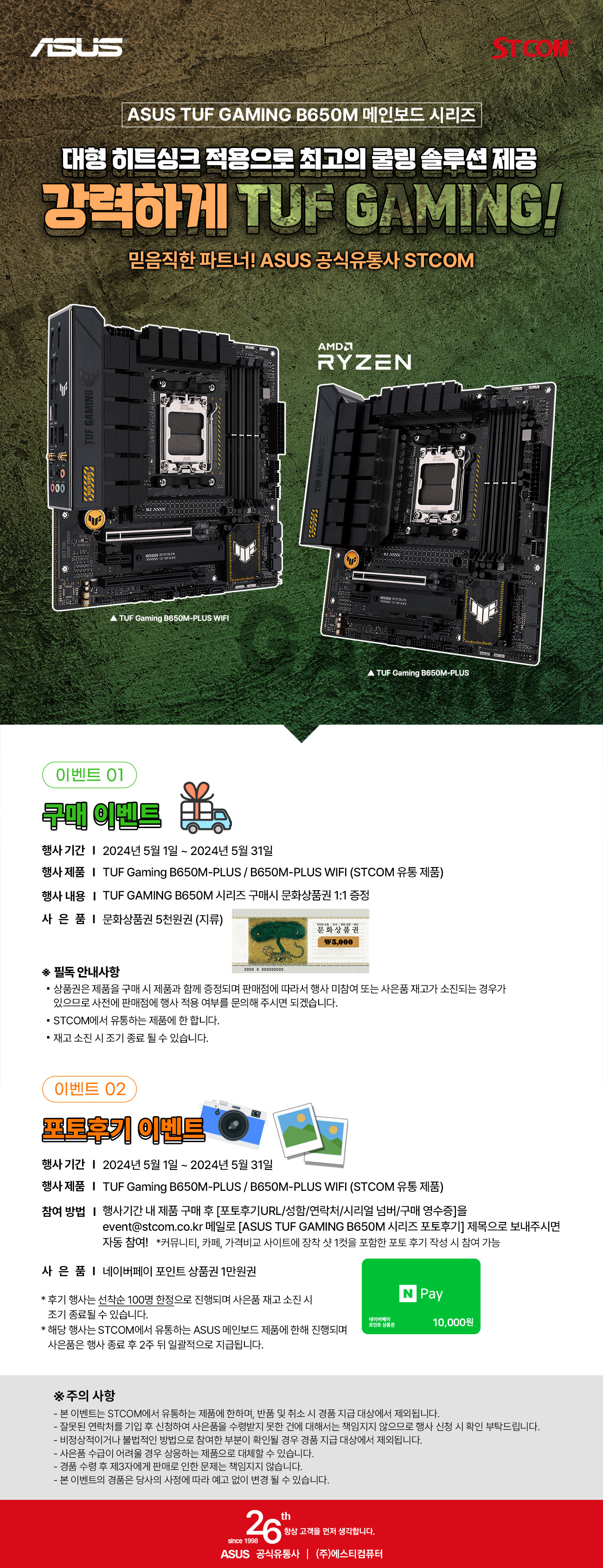5월 구매 행사는 2024년 5월 1일부터 5월 31일까지 진행되며 기간 내에 STCOM에서 유통하는 ASUS TUF Gaming B650M-PLUS 혹은 B650M-PLUS WIFI를 구매 시 문화상품권 5천원을 기본 증정한다. 추가적으로 커뮤니티, 가격비교사이트, 등에 장착샷 1컷을 포함한 사용 후기를 작성하여 event@stcom.co.kr로 성함과 연락처, 시리얼 넘버와 구매영수증, 사용기 URL을 첨부하여 신청 시 네이버 페이 기프티콘 1만원 권을 받을 수 있다.
