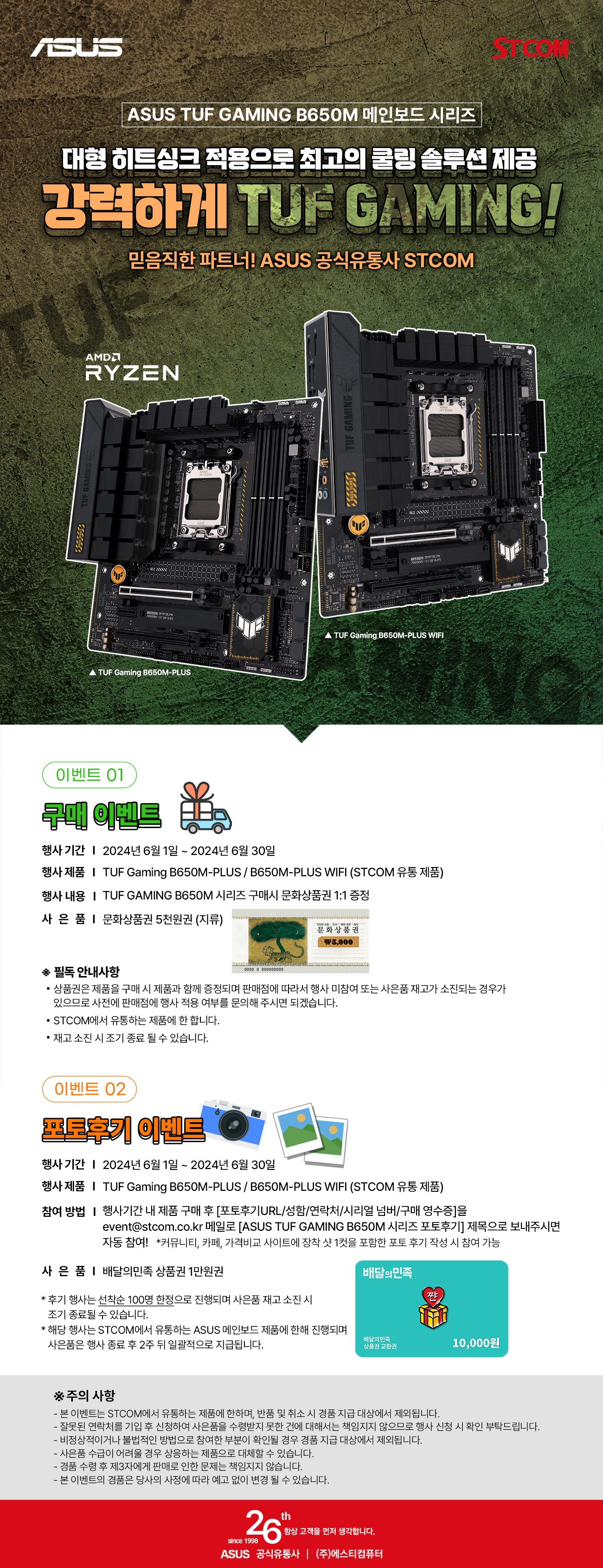 2024년 6월 1일부터 6월 30일까지 진행되는 이 행사는 기간 내에 STCOM에서 유통하는 ASUS TUF Gaming B650M-PLUS 혹은 B650M-PLUS WIFI를 구매 시 문화상품권을 기본 증정한다. 추가적으로 IT 커뮤니티, 가격비교사이트 등에 제품 장착 이미지 1컷을 포함한 사용 후기를 작성 시 모바일 기프티콘을 추가로 받을 수 있다. 후기 행사는 event@stcom.co.kr로 성함과 연락처, 시리얼 넘버와 구매영수증, 사용기 URL을 첨부하여 신청 시 참여가 가능하다.