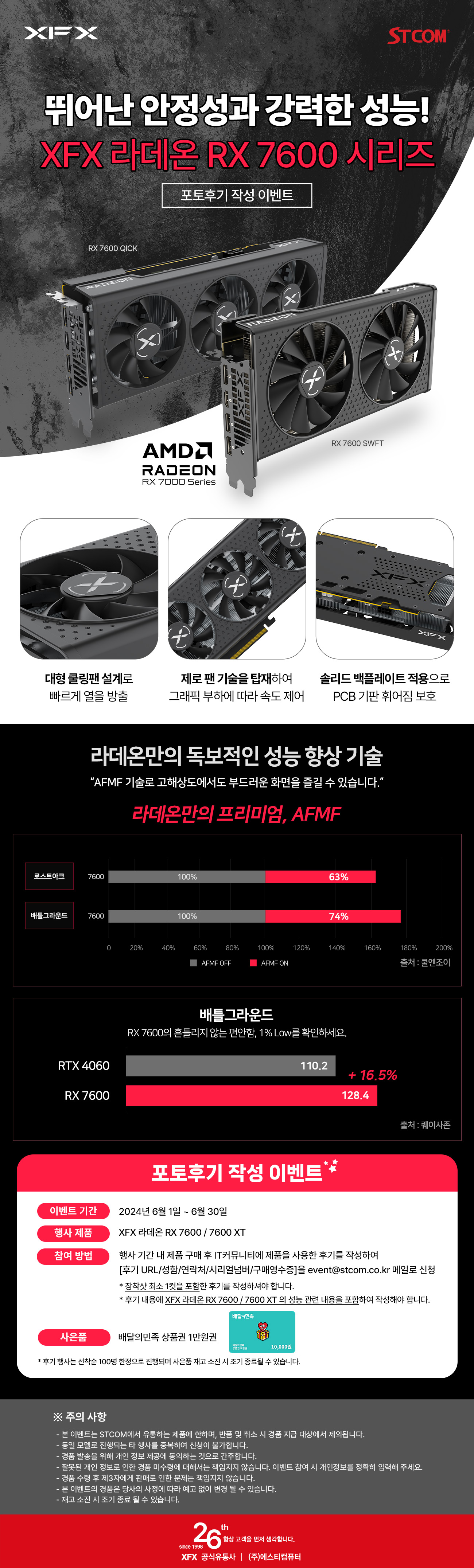 1998년 설립되어 20년 이상 컴퓨팅 관련 솔루션을 유통해온 전문 유통사인 (주)에스티컴퓨터 (대표: 서희문, 이하 STCOM)는 프레임 추가 생성 기능인 AFMF 사용이 가능하여 더욱 높은 가성비를 가진 XFX 라데온 RX7600, 7600 XT 시리즈를 대상으로 포토 후기를 작성하는 행사를 진행한다.