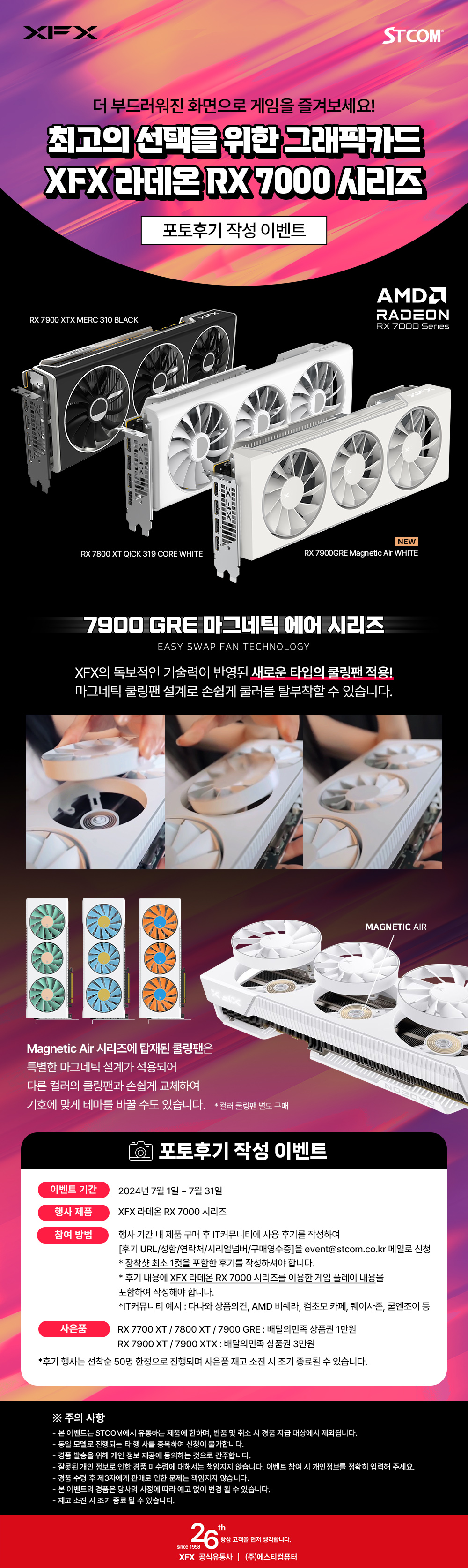1998년 설립되어 20년 이상 컴퓨팅 관련 솔루션을 유통해온 전문 유통사인 (주)에스티컴퓨터 (대표: 서희문, 이하 STCOM)는 XFX 라데온 RX 7000 시리즈 구매자를 대상으로 후기 작성 행사를 진행한다.