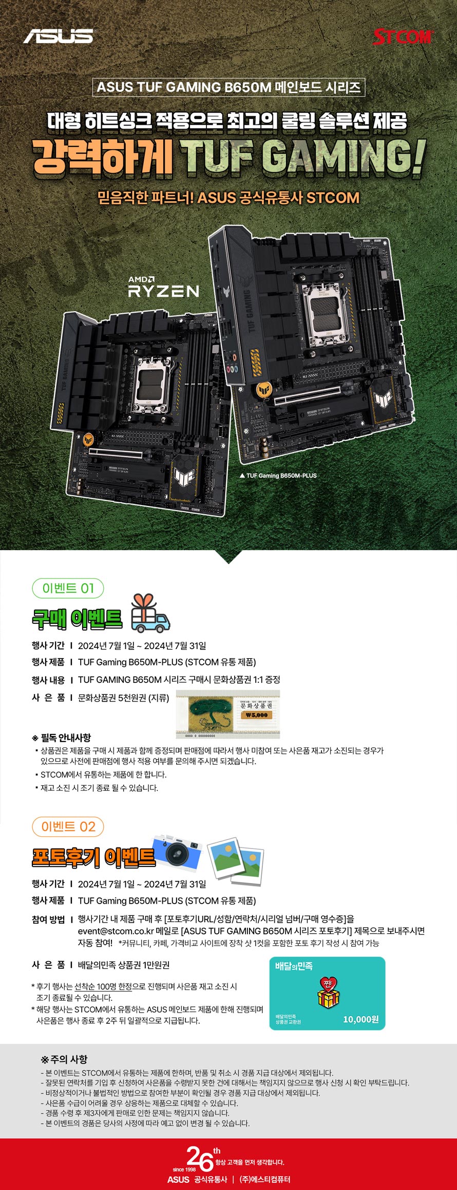 2024년 7월 1일부터 7월 31일까지 진행되는 이 행사는 기간 내에 STCOM에서 유통하는 ASUS TUF Gaming B650M-PLUS를 구매 시 문화상품권 5천원을 기본 증정한다. 추가적으로 IT 커뮤니티, 가격비교사이트 등에 제품 장착 이미지 1컷을 포함한 사용 후기를 작성 시 배달의 민족 모바일 기프티콘 1만원을 추가로 받을 수 있다. 후기 행사는 event@stcom.co.kr로 성함과 연락처, 시리얼 넘버와 구매영수증, 사용기 URL을 첨부하여 신청 시 참여가 가능하다.