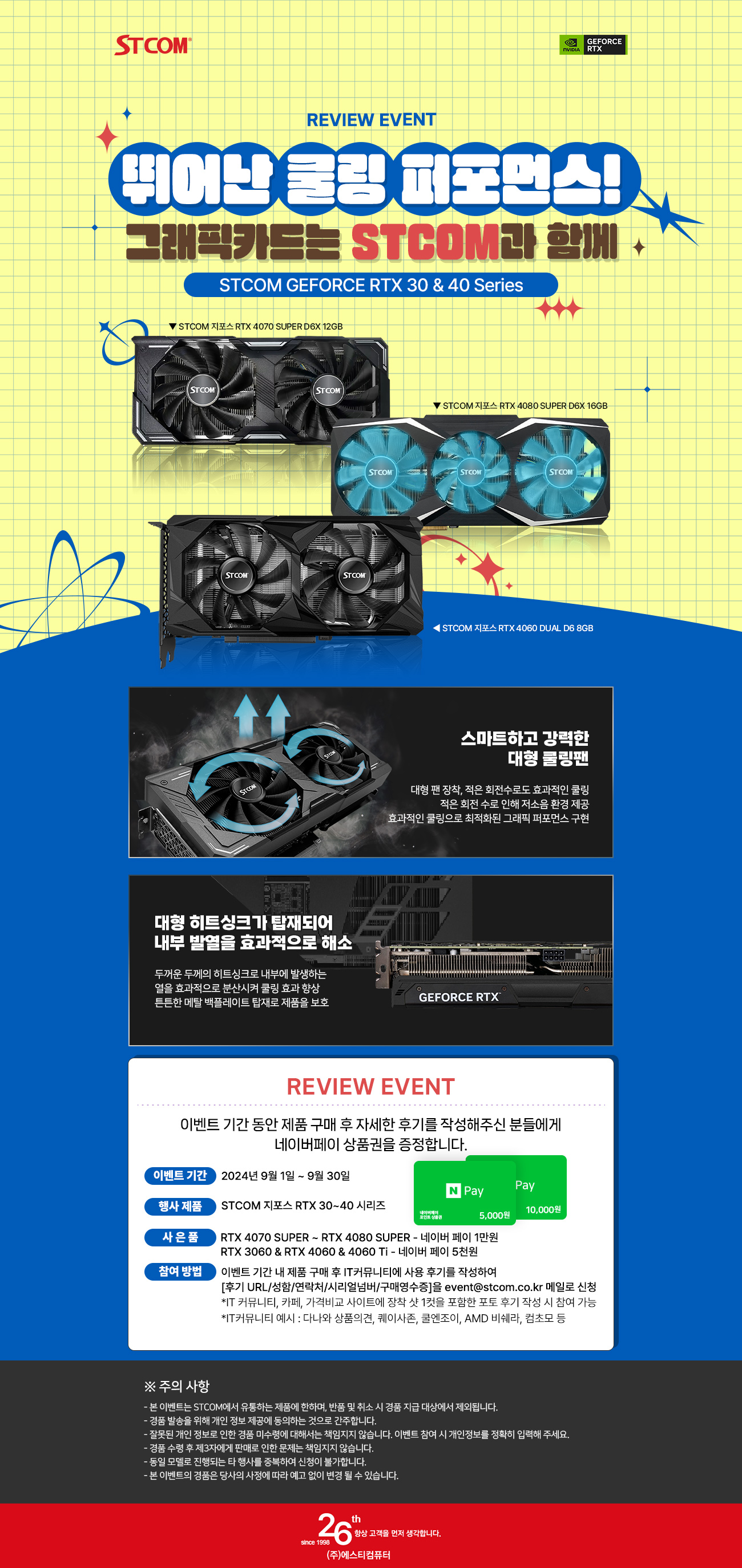 1998년 설립되어 전문적으로 컴퓨팅 관련 제품군을 국내에 공급해온 (주)에스티컴퓨터(이하, STCOM)는 유통사인 (주)에스티컴퓨터(대표 서희문, 이하 STCOM)는 STCOM 지포스 RTX 30 & 40 시리즈 그래픽카드 구매자를 대상으로 9월 구매 후기 작성 행사를 진행한다.