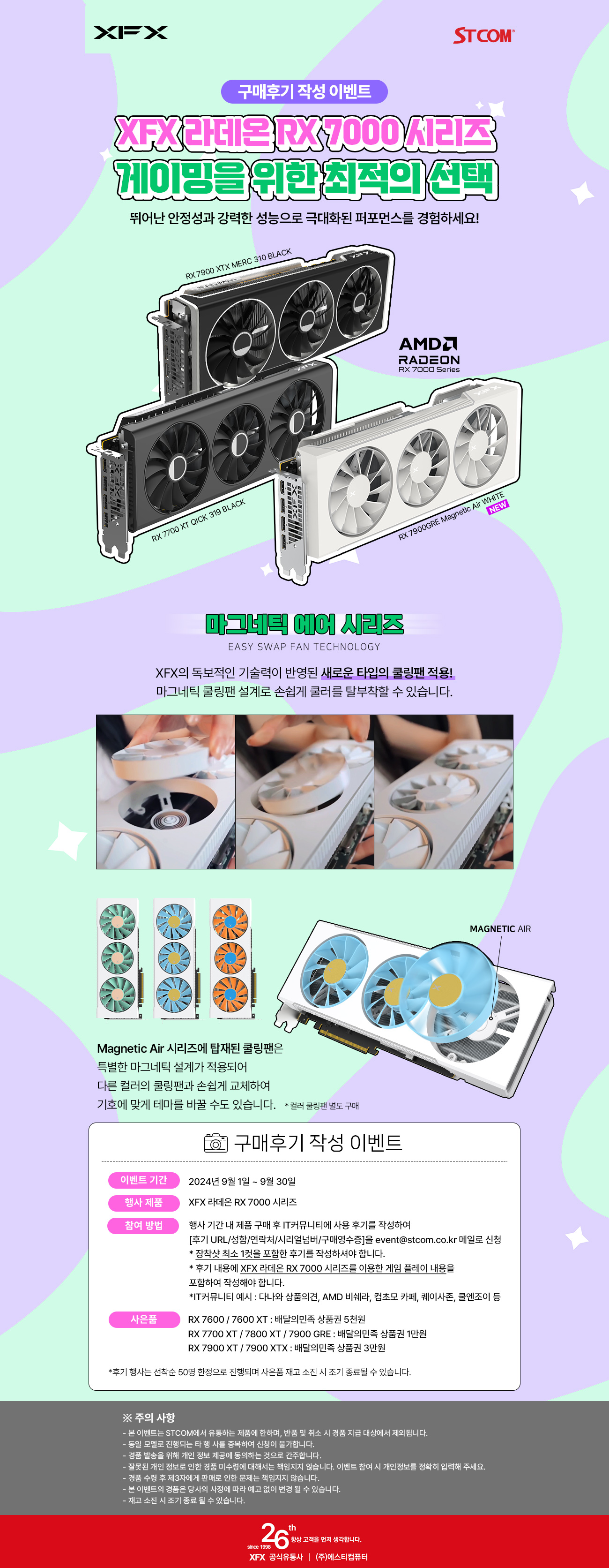 후기 행사는 자석 설계로 쿨링팬 탈부착이 자유로운 XFX의 신규 라인업인 RX 7900 GRE Magnetic Air를 포함한 RX 7600 ~ RX 7900 XTX를 대상으로 진행된다. 2024년 9월 1일부터 9월 30일까지 행사 대상 제품을 구매 후 커뮤니티, 가격비교사이트 등에 게임 플레이 후 이에 대한 사용기를 작성하여 인증 시 참여가 가능하며 event@stcom.co.kr 로 후기 URL, 구매 영수증, 시리얼 번호, 성함 및 연락처를 접수하여 신청하면 된다.