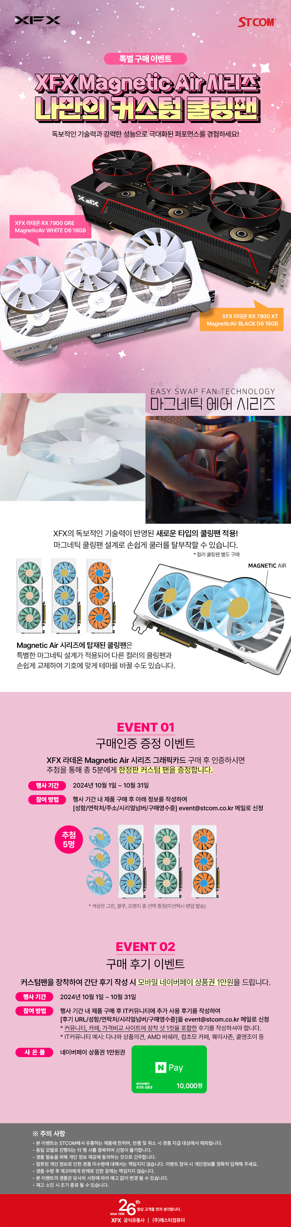 1998년 설립되어 20년 이상 컴퓨팅 관련 솔루션을 유통해온 전문 유통사인 (주)에스티컴퓨터 (대표: 서희문, 이하 STCOM)는 쿨링팬 탈착이 가능한 XFX의 신규 라인업인 마그네틱 에어 시리즈 그래픽카드가 포함된 완본체 구매자를 대상으로 한정판 커스텀 쿨러 추첨 증정 이벤트를 진행한다.