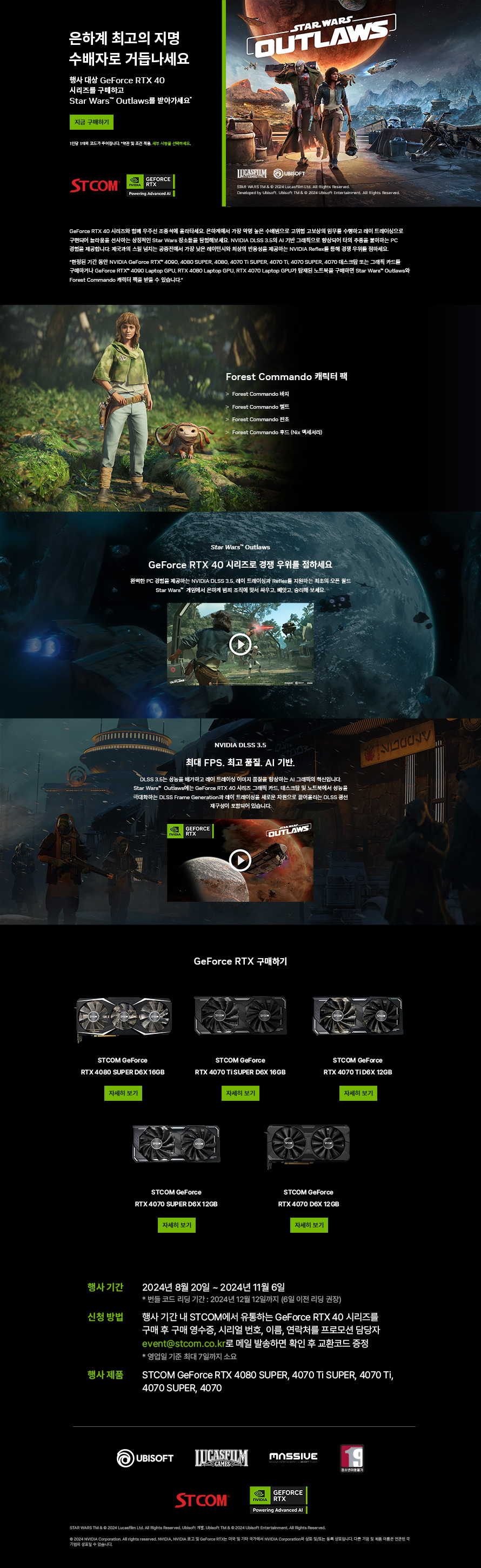 1998년 설립되어 전문적으로 컴퓨팅 관련 제품군을 국내에 공급해온 (주)에스티컴퓨터(이하, STCOM)는 유통사인 (주)에스티컴퓨터(대표 서희문, 이하 STCOM)는 STCOM 지포스 RTX 40 시리즈 그래픽카드 구매자를 대상으로 스타워즈: 아웃로 게임 번들 행사를 연장하여 진행한다.