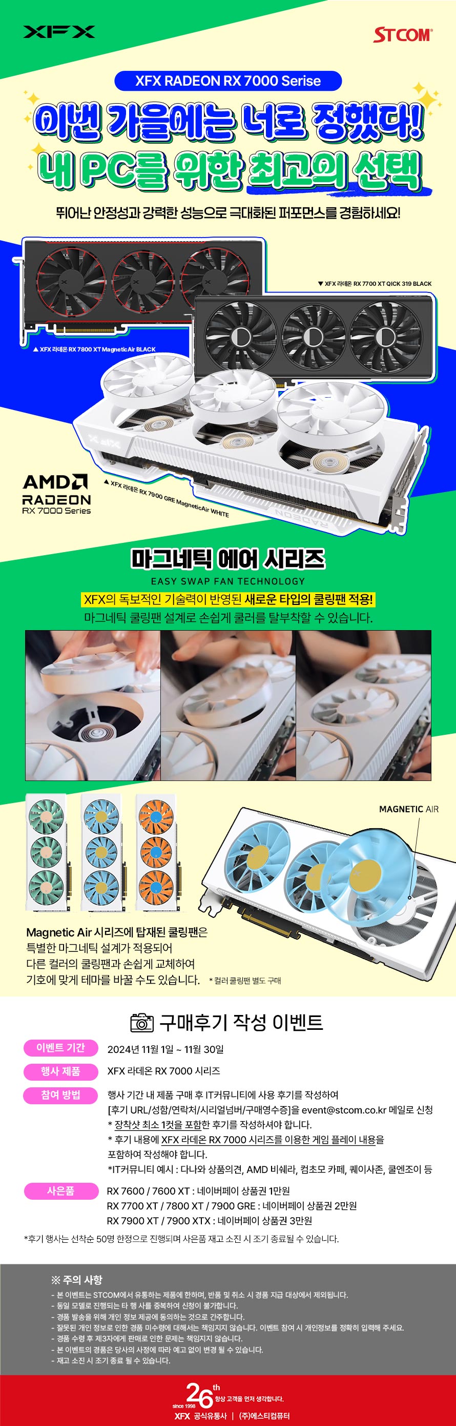 후기 행사는 자석 설계로 쿨링팬 탈부착이 자유로운 XFX의 최신 라인업인 라데온 RX 7900 GRE Magnetic Air WHITE와 RX 7800 XT Magnetic Air BLACK을 포함한 RX 7600 ~ RX 7900 XTX 그래픽카드를 대상으로 진행된다. 2024년 11월 1일부터 11월 30일까지 행사 대상 제품을 구매 후 커뮤니티, 가격비교사이트 등에 제품에 대한 사용기를 작성하여 인증 시 참여가 가능하며 event@stcom.co.kr 로 후기 URL, 구매 영수증, 시리얼 번호, 성함 및 연락처를 접수하여 신청하면 된다.