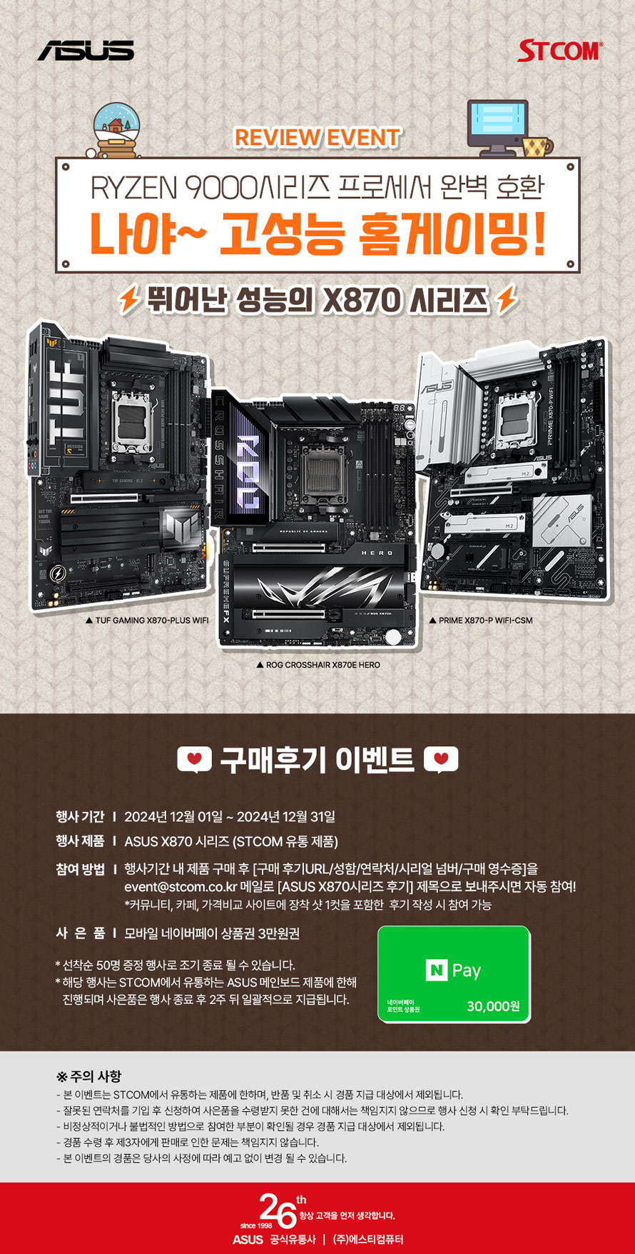 ASUS 메인보드를 국내에 공급하고 있는 (주)에스티컴퓨터 (대표: 서희문, 이하 STCOM)는 AMD 라이젠 9000 시리즈 전용 메인보드인 ASUS의 X870 시리즈를 대상으로 12월 구매 후기 행사를 진행한다.