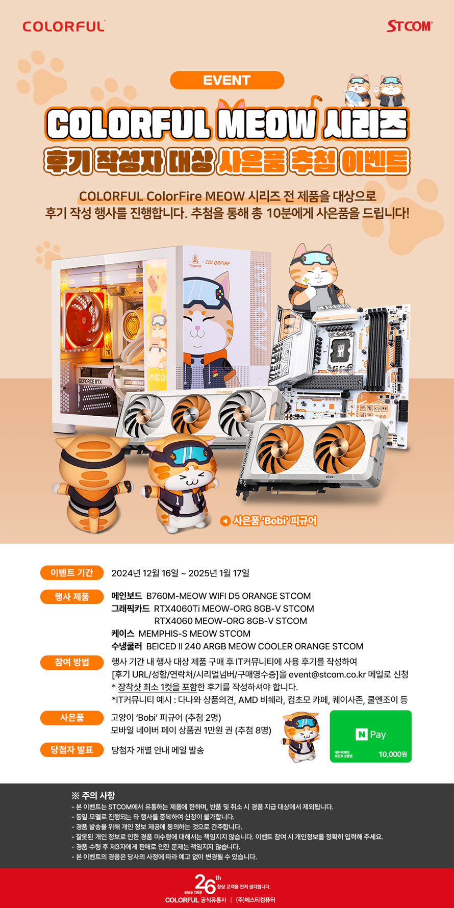 해당 후기 작성 행사는 2024년 12월 16일부터 2025년 1월 17일 내에 컬러풀 COLORFIRE MEOW 시리즈 제품을 구매하신 고객을 대상으로 진행되며 제품 구매 후 IT 커뮤니티, 카페 등 1곳에 제품 후기를 작성 후 event@stcom.co.kr로 신청 시 참여가 가능하다. 참여자 중 추첨 10명을 선정하여 고양이 “Bobi” 피규어 혹은 모바일 네이버 페이 상품권 1만원을 증정한다.
