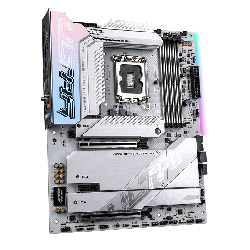 iGame Z890 ULTRA V20은 팝아트 컨셉 디자인이 적용된 ATX 규격의 메인보드로, 기판과 방열판, 아머 모두 화이트 색상으로 제작되어 시스템을 구성하고자 하는 유저들에게 적합한 제품이다. 인텔의 신규 세대인 코어 울트라 프로세서 CPU와의 구성에 적합하도록 튼튼한 20+1+1+1 Dr.MOS 전원부와 발열을 효과적으로 제어할 수 있는 대형 방열판이 장착되었다. 또한 장착된 M.2 스토리지를 보호하기 위해 제품 전면에 풀 메탈 아머가 설계되었다.