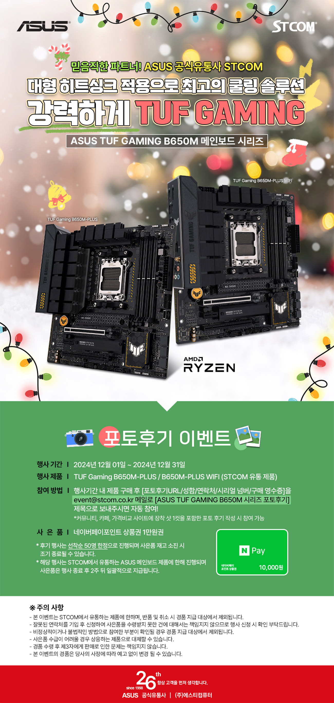 2024년 12월 1일부터 12월 31일까지 진행되는 이 행사는 기간 내에 STCOM에서 유통하는 ASUS TUF Gaming B650M-PLUS 혹은 B650M-PLUS WIFI 제품을 구매 후 IT 커뮤니티, 가격비교사이트 중 1곳에 제품 장착 이미지 1컷을 포함한 사용 후기를 작성 시 네이버 페이 기프티콘 1만원을 증정한다. 해당 행사는 event@stcom.co.kr로 성함과 연락처, 시리얼 넘버와 구매영수증, 사용기 URL을 첨부하여 신청 시 참여가 가능하다.