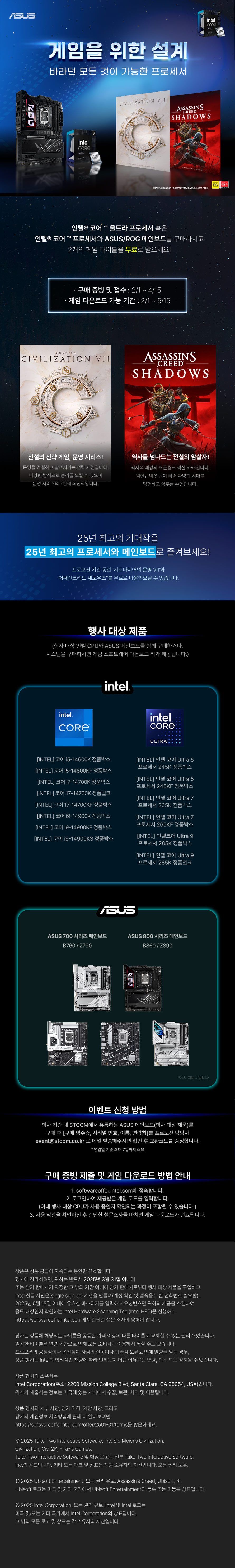 행사 사은품인 번들은 총 두 가지 게임 타이틀로 구성되었다. 문명을 건설하고 발전시키는 전략 게임으로 많은 게이머들에게 사랑을 받은 “문명 7”과 오픈월드 액션 RPG 게임인 “어쌔신 크리드: 쉐도우”를 모두 받을 수 있어 한층 더 가성비 있게 ASUS 인텔 메인보드를 구매할 수 있다.