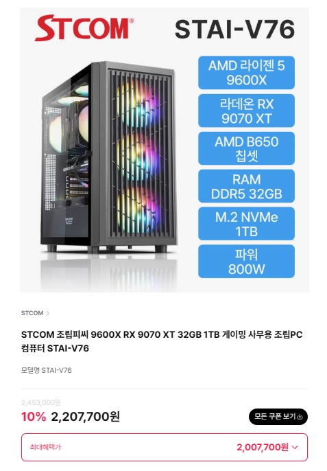 STCOM, XFX 라데온 9070 XT가 탑재된 “STAI-V76” 조립 피씨 특가 진행!