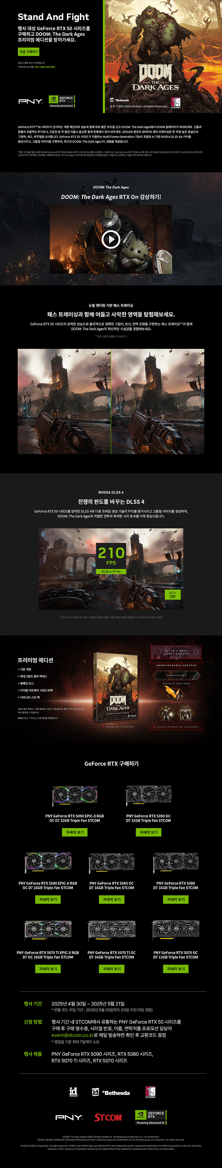 PC 컴포넌트 제조 분야에서 30년 이상의 경력으로 높은 평가를 받고 있는 PNY의 국내 유통사인 (주)에스티컴퓨터(이하, STCOM)는 PNY 지포스 RTX 50 시리즈 그래픽카드 구매자를 대상으로 DOOM: The Dark Ages 게임 번들 증정 행사를 진행한다.