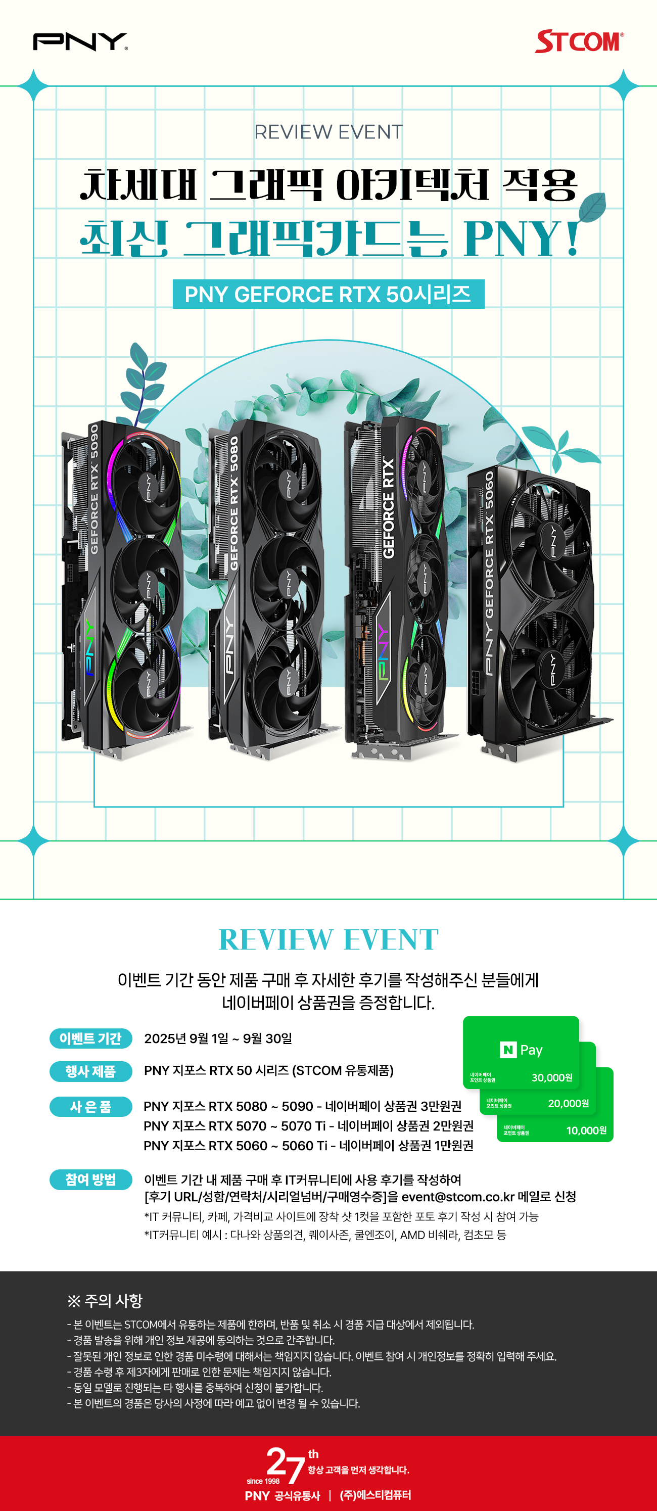 9월 행사는 STCOM에서 유통하는 PNY 지포스 RTX 50 시리즈 전 제품을 대상으로 2025년 9월 1일부터 9월 30일까지 진행되며, 기간 내 구매자를 대상으로 IT 커뮤니티, 가격비교사이트 중 1곳에 제품 이미지 1컷을 포함한 사용 후기를 작성 시 모델에 따라 네이버 페이 기프티콘을 차등 증정한다.
