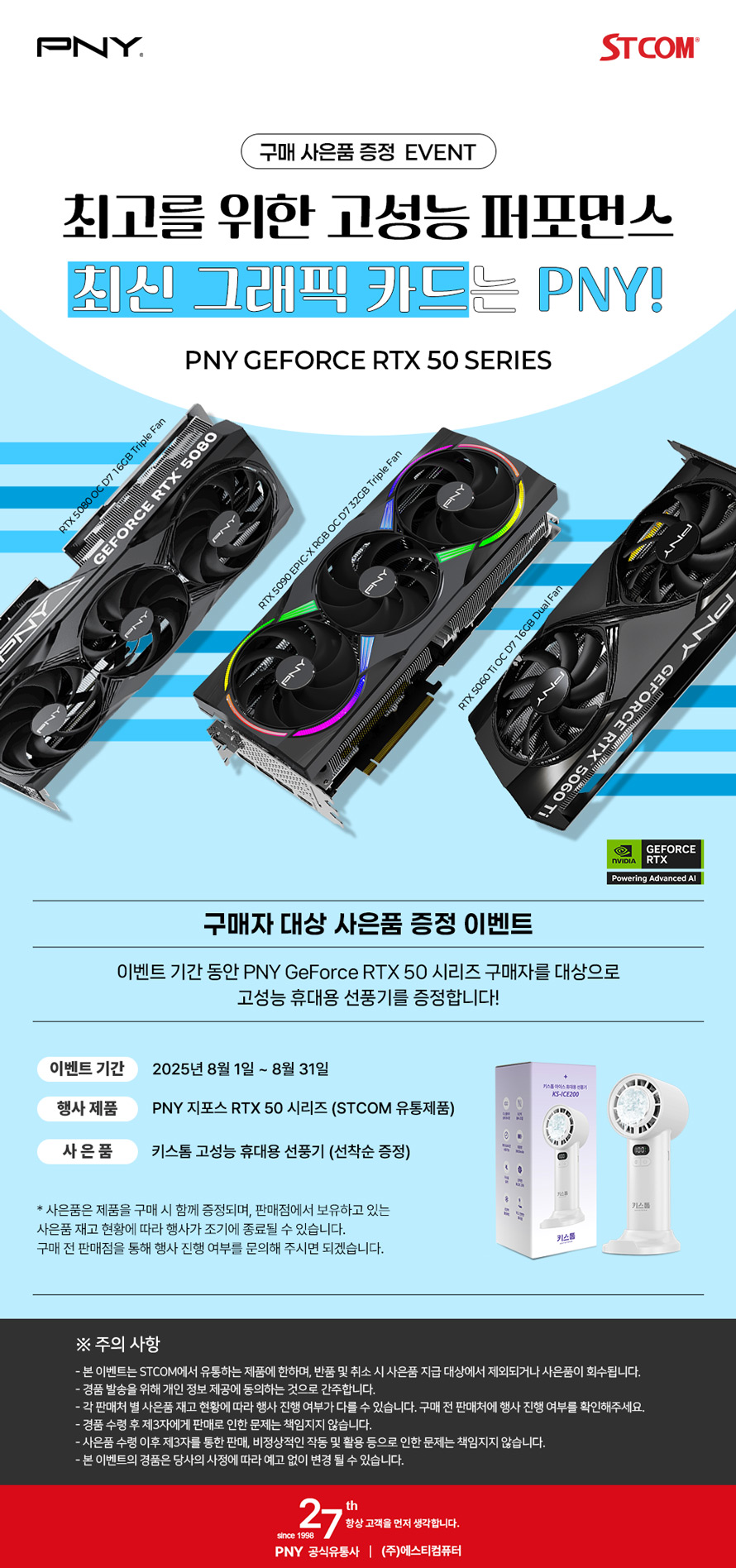 구매 사은품 행사는 STCOM에서 유통하는 PNY 지포스 RTX 50 시리즈 전 제품을 대상으로 2025년 8월 1일부터 8월 31일까지 진행된다. 기간 내 제품 구매자를 대상으로 여름철 필수 아이템인 고성능 키스톰 휴대용 선풍기 증정한다.