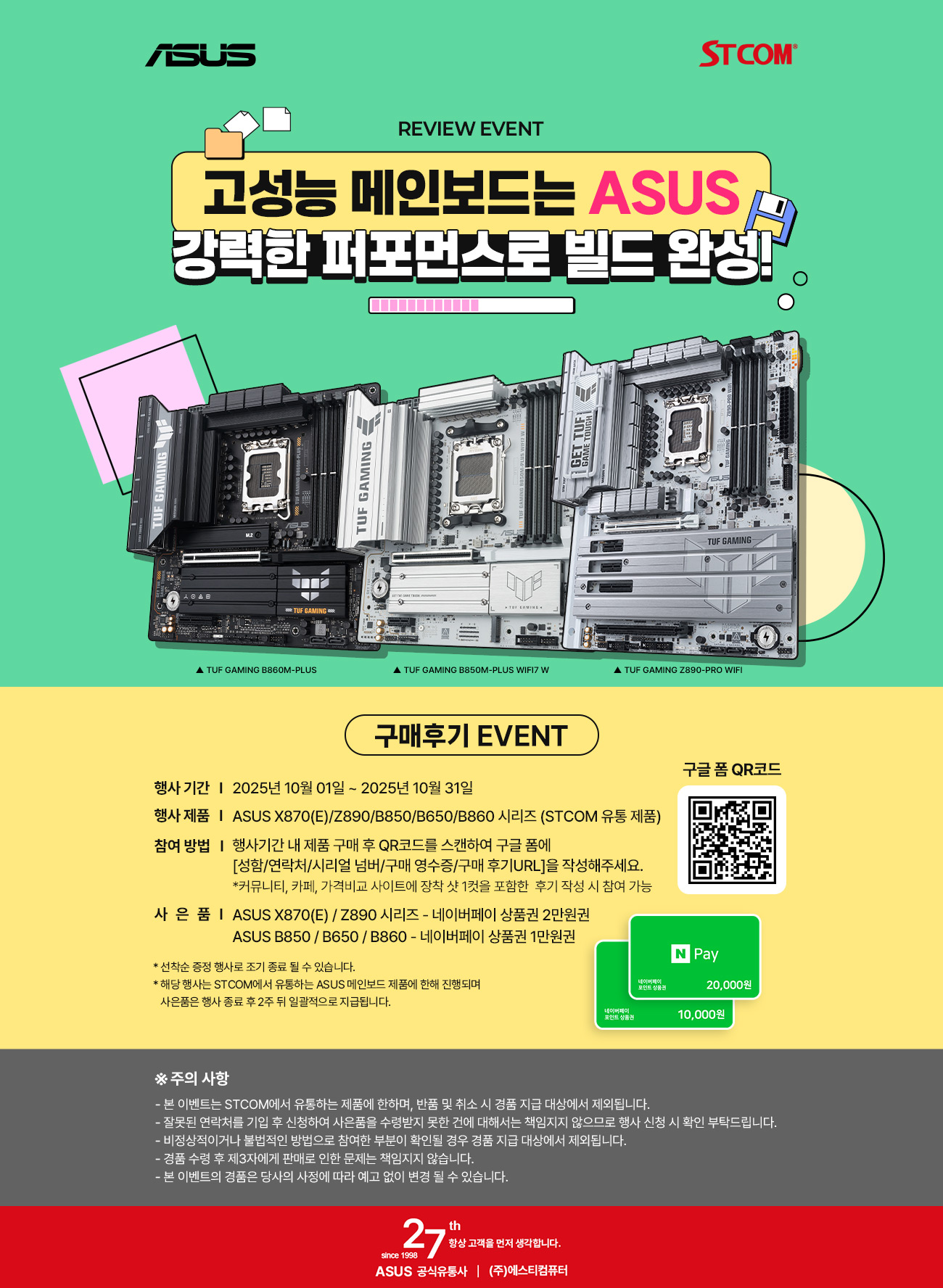 구매 후기 행사는 2025년 10월 1일부터 10월 31일까지 진행되며, 기간 내에 STCOM에서 유통하는 ASUS의 인텔 메인보드 (Z890, B860) 혹은 AMD 메인보드 (X870(E), B850, B650) 제품을 구매 후 IT 커뮤니티, 가격비교사이트 중 1곳에 제품 이미지 1컷을 포함한 사용 후기를 작성 시 제품에 따라 네이버 페이 기프티콘을 차등 증정한다. 해당 행사는 페이지 내 QR코드를 통해 참여가 가능하며, 선착순 신청으로 진행되므로 사은품이 모두 소진될 시 조기에 종료될 수 있다.
