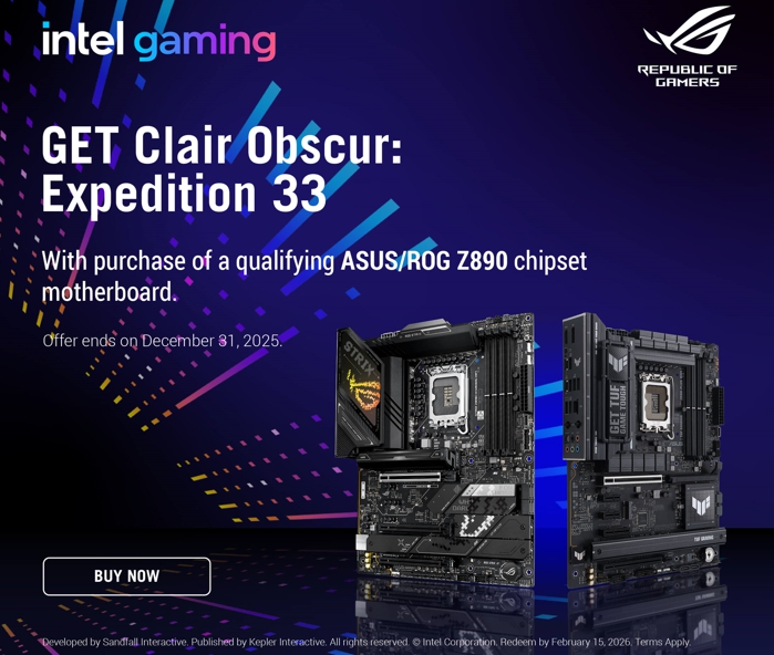 행사 사은품인 게임 번들은 “클레르 옵스퀴르: 33원정대”로 독특한 미학과 턴제 기반 실시간 전투 시스템을 결합한 작품이며, 예술적 감성과 전략적 플레이를 동시에 즐길 수 있는 게임으로 평가받고 있다. 해당 행사를 통해 ASUS의 인텔 코어 울트라 프로세서 전용 하이엔드 메인보드를 더욱 가성비 있게 구매할 수 있다.