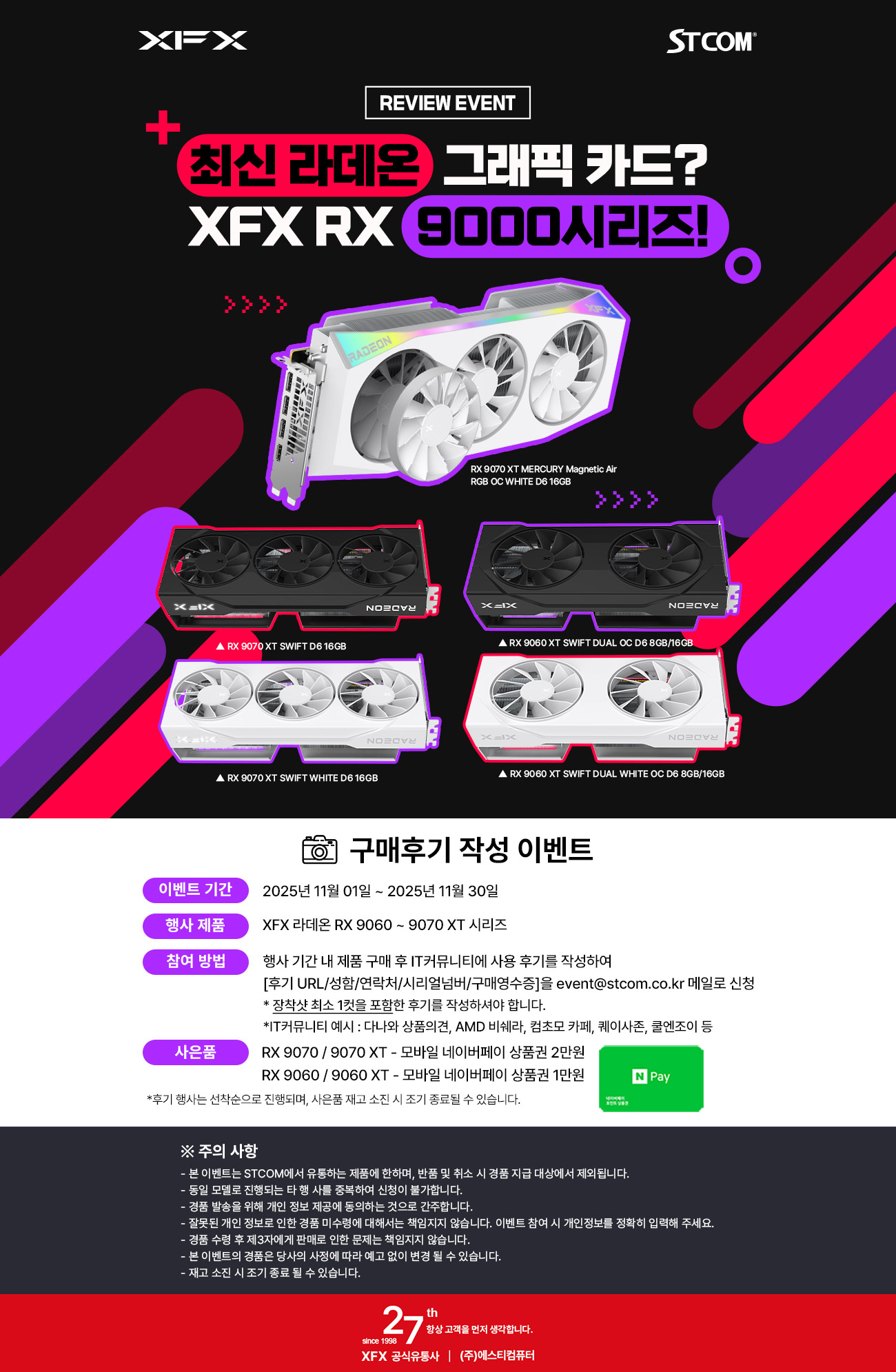 1998년 설립되어 20년 이상 컴퓨팅 관련 솔루션을 유통해온 전문 수입사인 (주)에스티컴퓨터 (대표: 서희문, 이하 STCOM)는 XFX 라데온 RX 9000 시리즈 그래픽카드 전 제품을 대상으로 11월 사용 후기 작성 행사를 진행한다.
