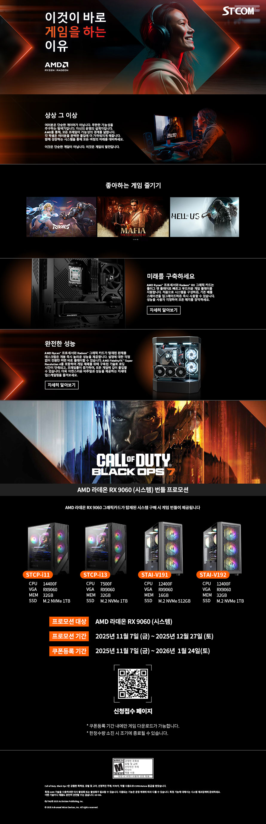 본 번들 행사는 2025년 11월 7일부터 12월 27일까지 진행되며 합리적인 가격에 원활한 게이밍 성능을 경험할 수 있는 XFX 라데온 RX 9060을 포함하여 구성된 STCOM 조립 PC 4종을 대상으로 진행된다. 기간 내 행사 대상 제품을 구매 후 QR 코드를 통해 신청 시 번들 코드를 수령할 수 있다. 행사 대상 제품은 아래와 같다.