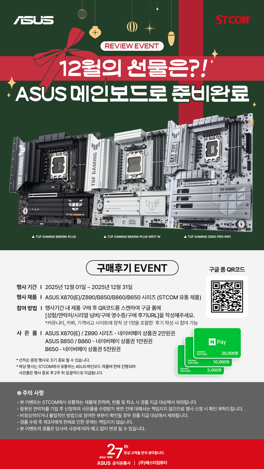 구매 후기 행사는 2025년 12월 1일부터 12월 31일까지 진행되며, 기간 내에 STCOM에서 유통하는 ASUS의 인텔 메인보드 (Z890, B860) 혹은 AMD 메인보드 (X870(E), B850, B650(E)) 제품을 구매 후 IT 커뮤니티, 가격비교사이트 중 1곳에 제품 이미지 1컷을 포함한 사용 후기를 작성 시 제품에 따라 네이버 페이 기프티콘을 차등 증정한다. 해당 행사는 페이지 내 QR코드를 통해 참여가 가능하며, 선착순 신청으로 진행되므로 사은품이 모두 소진될 시 조기에 종료될 수 있다.