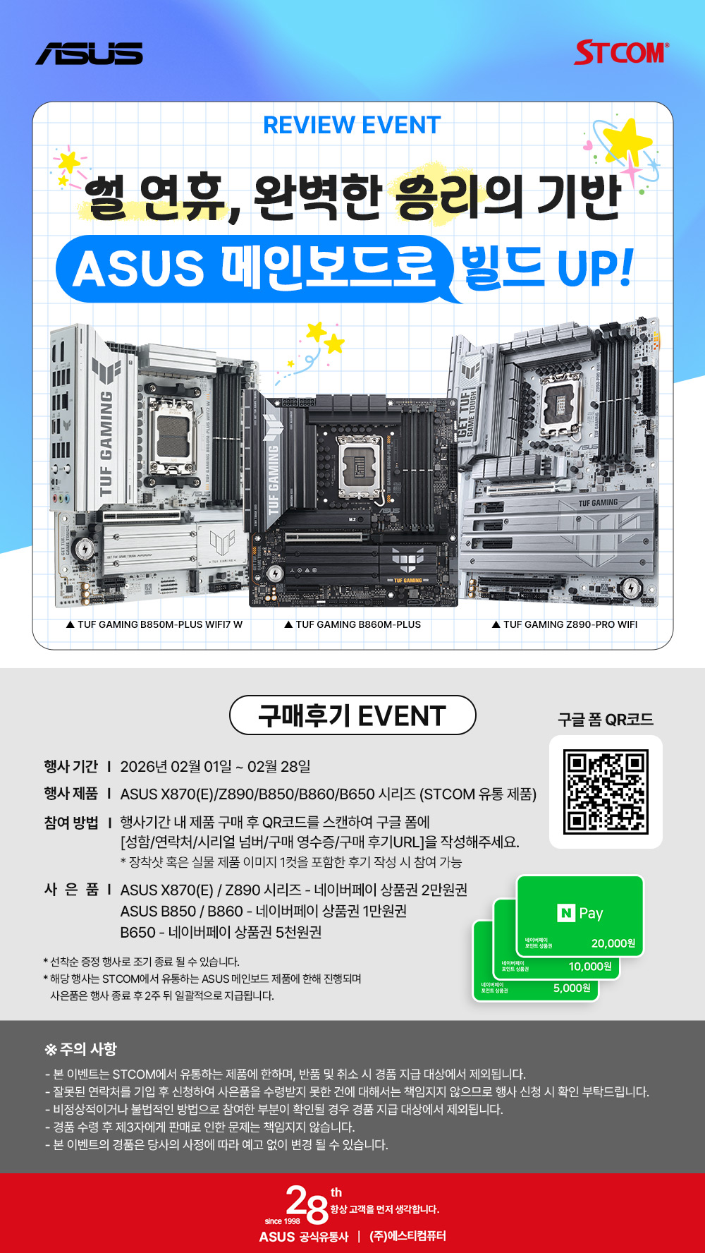 2026년 2월 1일부터 2월 28일까지 STCOM에서 유통하는 ASUS 행사 대상 제품을 구매 후 IT 커뮤니티, 가격비교사이트 중 1곳에 제품 이미지 1컷을 포함한 사용 후기를 작성 시 제품에 따라 네이버 페이 기프티콘을 차등 증정한다. 해당 행사는 페이지 내 QR코드를 통해 참여가 가능하며, 선착순 신청으로 진행되므로 사은품이 모두 소진될 시 조기에 종료될 수 있다.