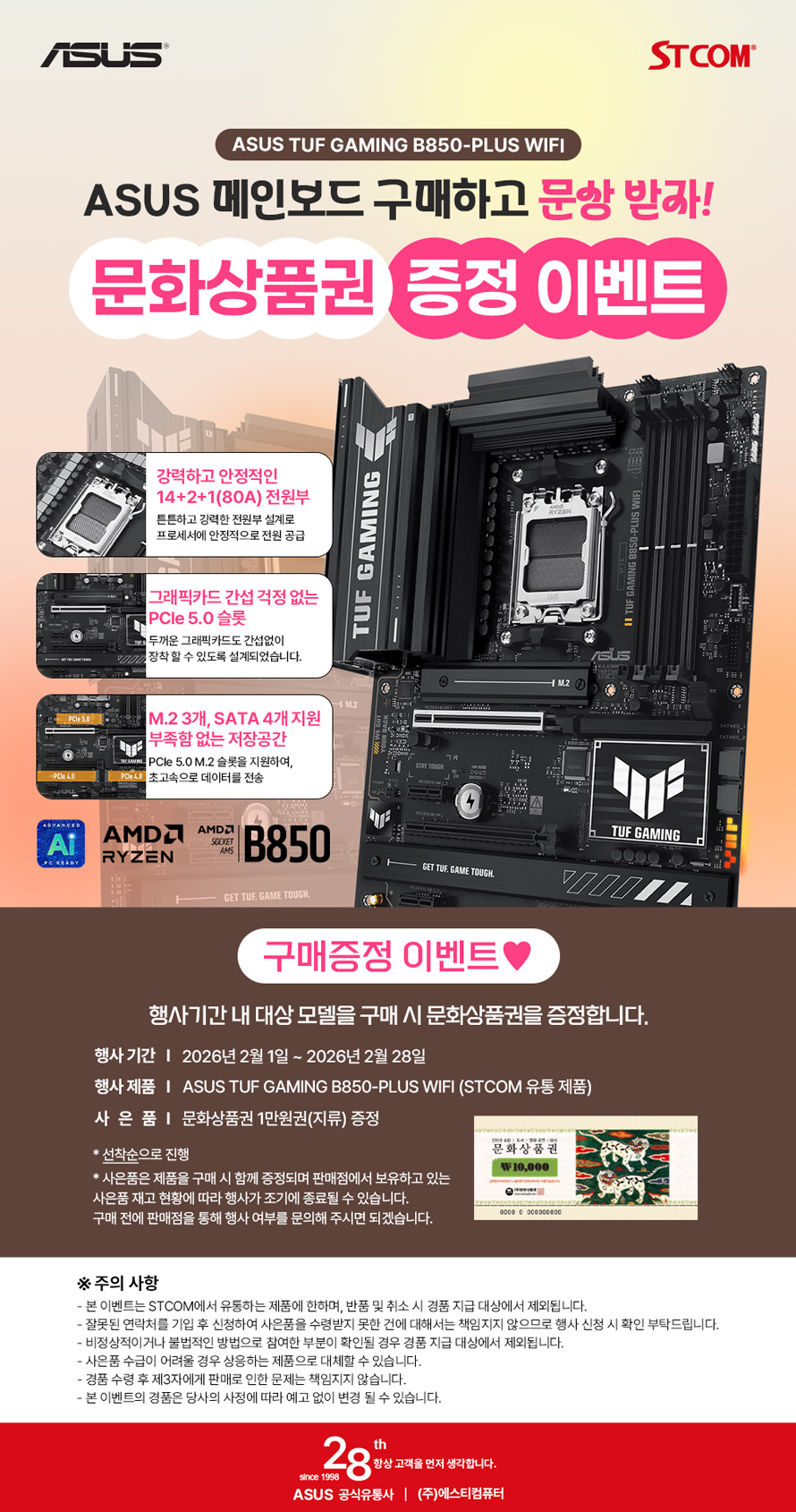 2026년 2월 1일부터 2월 28일까지 STCOM에서 유통하는 터프 게이밍 B850-PLUS WIFI 모델을 구매 시 지류 문화상품권 1만원 권을 선착순으로 증정한다. 판매처의 사은품 재고에 따라 행사가 조기에 종료될 수 있으므로 구매 전 판매처에 행사 진행 여부를 문의해야 원활하게 행사에 참여할 수 있다.