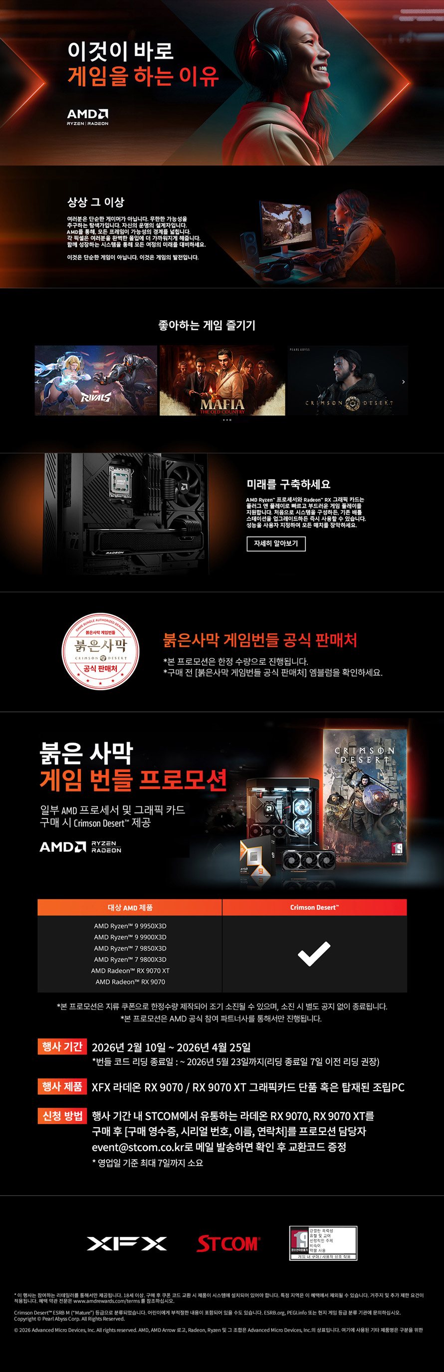1998년 설립되어 20년 이상 컴퓨팅 관련 솔루션을 유통해온 전문 유통사인 (주)에스티컴퓨터 (대표: 서희문, 이하 STCOM)는 XFX 라데온 RX 9070 시리즈 구매자를 대상으로 붉은 사막 번들 증정 행사를 진행한다.
