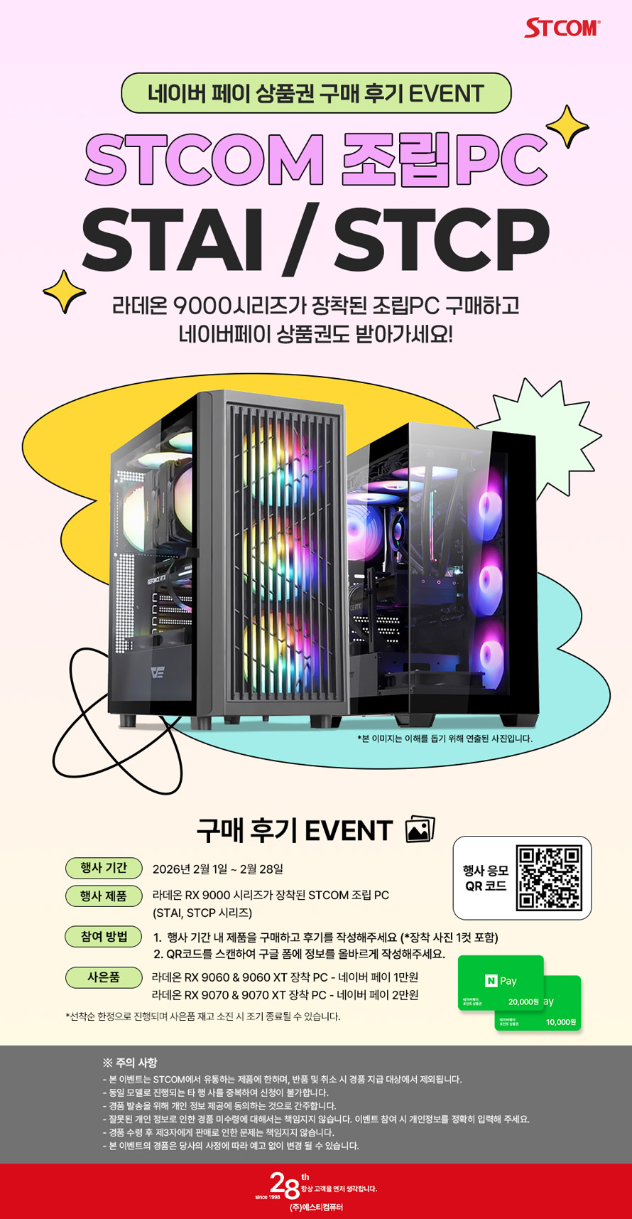 1998년 설립되어 20년 이상 컴퓨팅 관련 솔루션을 유통해온 전문 유통사인 (주)에스티컴퓨터 (대표: 서희문, 이하 STCOM)는 XFX 라데온 RX 9000 시리즈가 탑재된 STCOM 조립 PC를 구매 후 후기를 작성 시 사은품을 증정하는 이벤트를 진행한다.