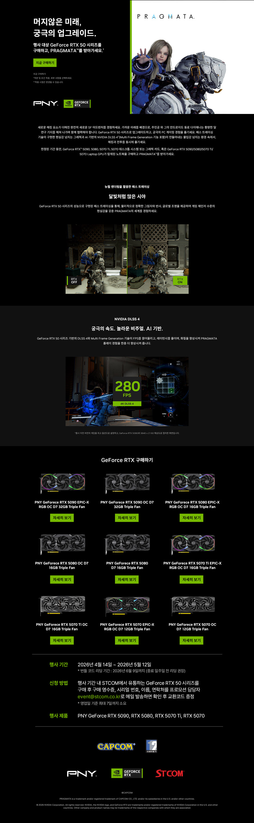 PC 컴포넌트 제조 분야에서 30년 이상의 경력으로 높은 평가를 받고 있는 PNY의 국내 유통사인 (주)에스티컴퓨터(이하, STCOM)는 PNY 지포스 RTX 50 시리즈 구매자를 대상으로 프래그마타(PRAGMATA) 신작 게임 번들 증정 행사를 진행한다.