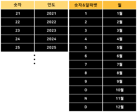 시리얼넘버의 2번째 번호를 통해 생산 월을 알 수 있습니다.